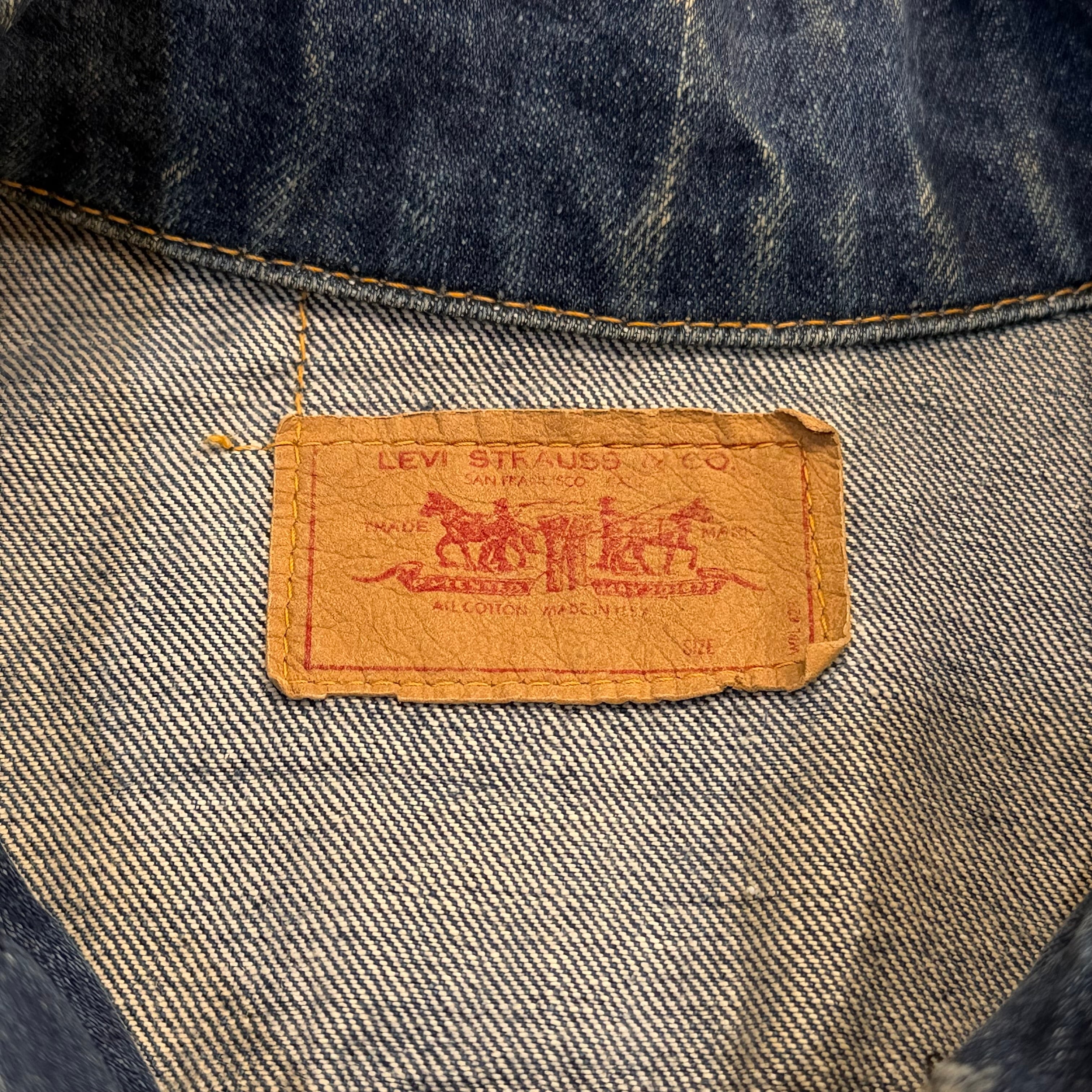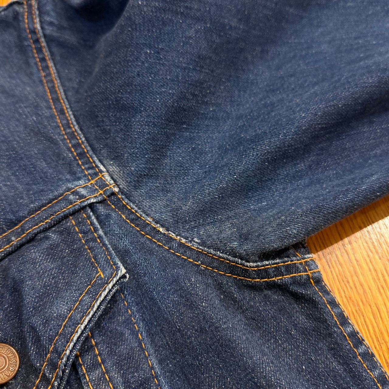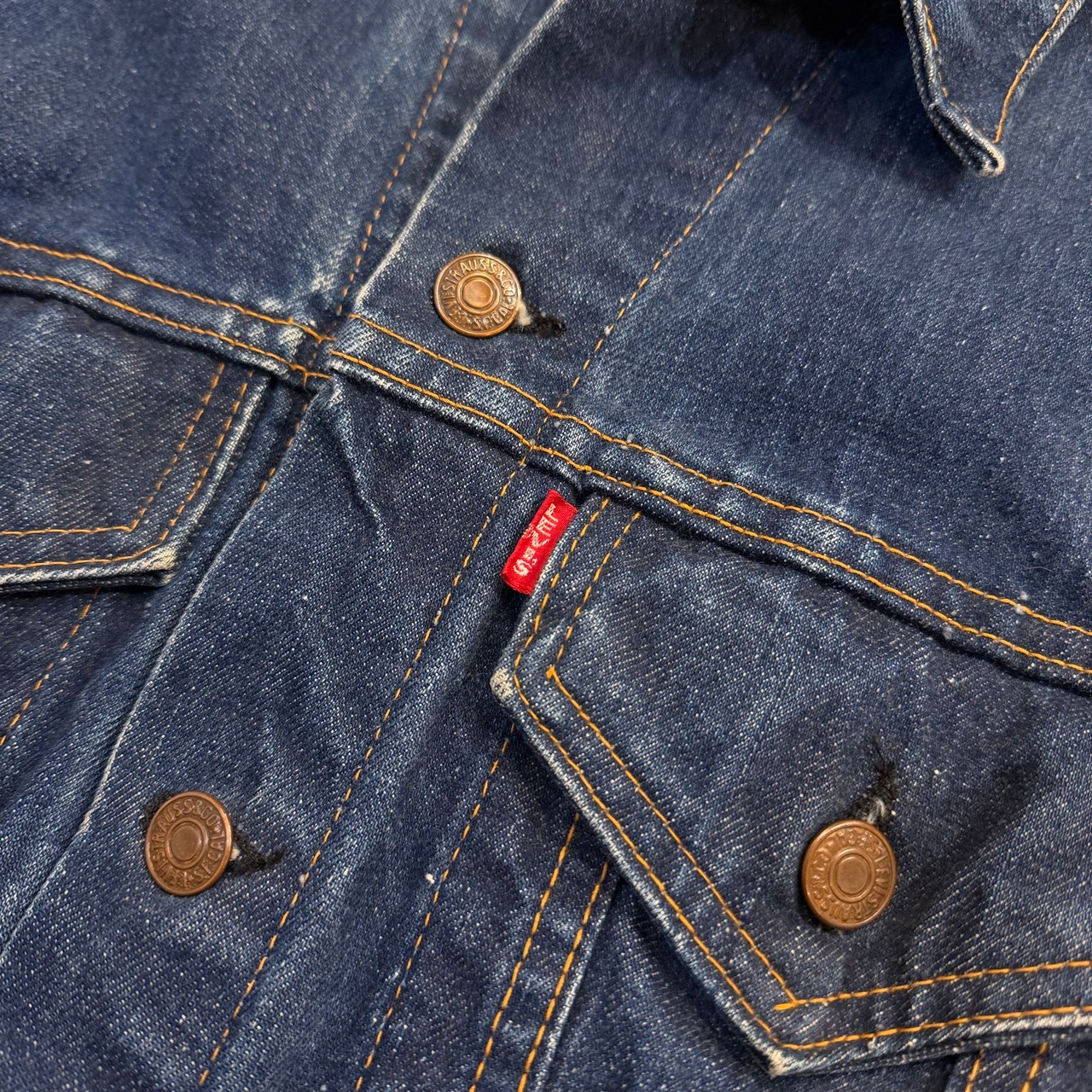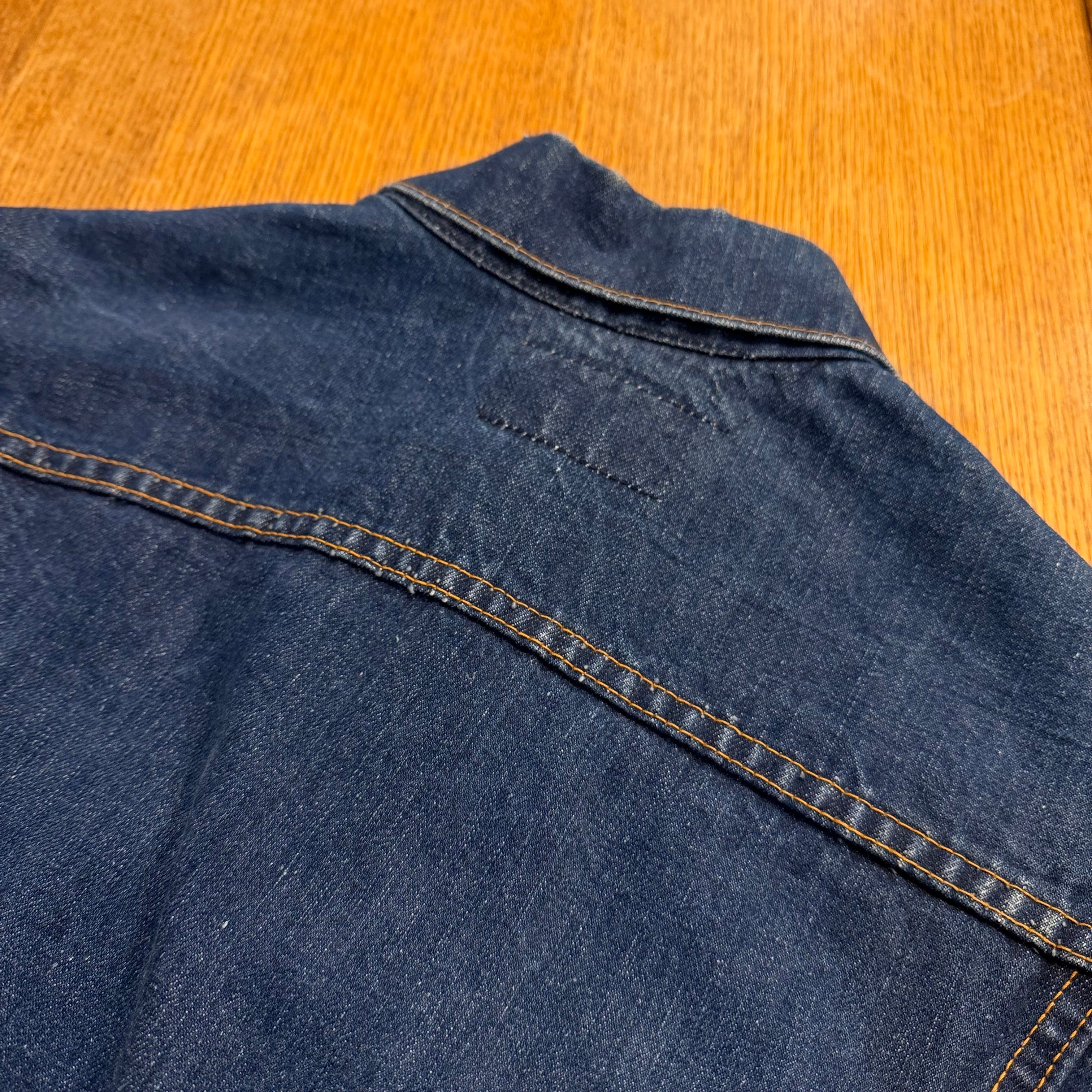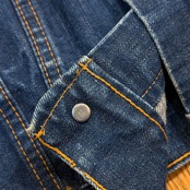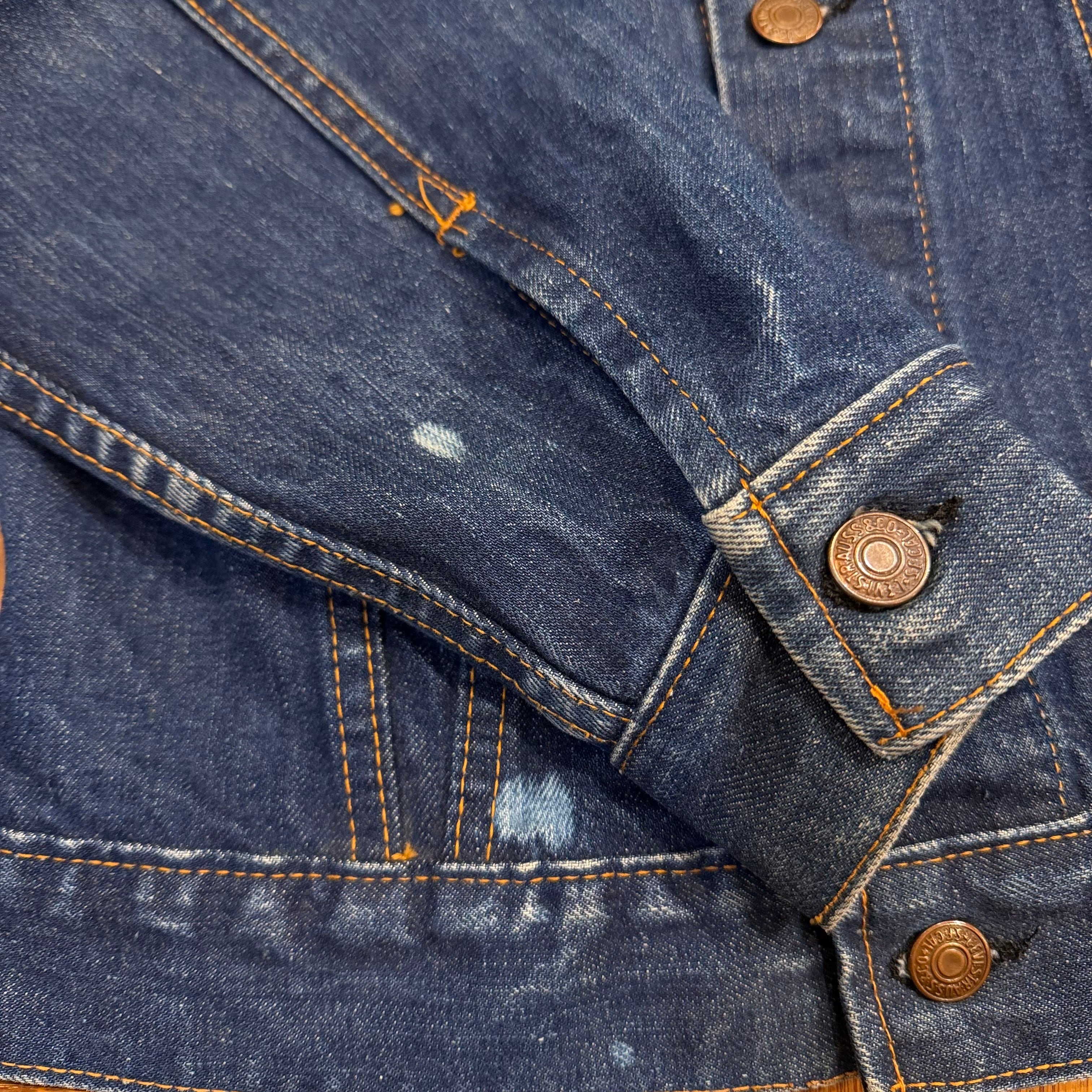 画像の様に右袖や裾付近にブリーチ跡、アタリ・スレ、所々に多少のステッチ抜け、襟に汚れはございますが、その他ダメージもなく、まだまだ十分にご着用いただけます。