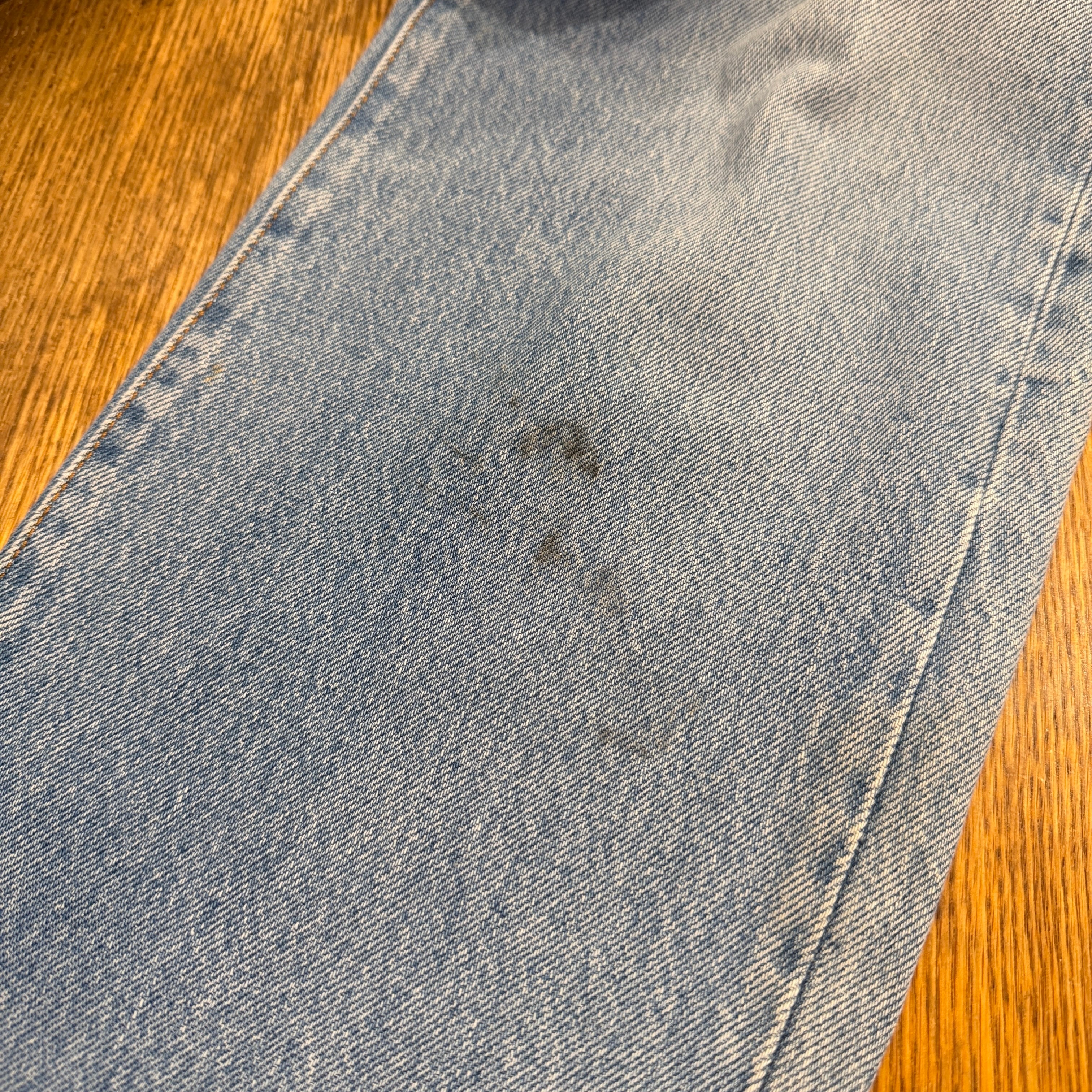 画像の様に特有のスレやアタリ・色落ち、タブの欠損、ポケット淵や裾・股など各所にスレ傷、ボタンホールにホツレやリペア、左ひざ下に汚れはございますが、その他大きなダメージもなく、まだまだ十分にご着用いただける状態です。